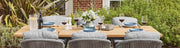 For added ambience beyond the table, think about the surrounding lighting. Fairy lights and festoons hung from trees or a pergola create a soft, twinkling backdrop. For lower levels, consider LED lantern lights that can be moved around to illuminate each zone. And to keep bugs at bay, large citronella candles in terracotta pots are always a worthwhile addition. For lighting that goes the distance, look for long-lasting solar-powered lanterns or freestanding outdoor lamps. Having the option to charge via USB cable helps when you need an added boost too.