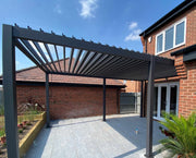 Our Rota Louvered Pergolas are versatile terrace covers with a wall mounted option to create a useful overhang from your home. This design is available in eight different sizes offering a variety of options to combine together to suit your space. There are optional Deluxe Side Screens that can be fixed to the pergola to create an enclosed space to protect you from the sun, wind and rain, and to keep the summer heat out of the house.