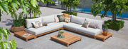 This L shaped lounge set can seat your friends very comfortably. The edges leave enough space to use as an end table and hold everything that is important to you, such as some ambient candlelight, plants or a summertime cocktail.