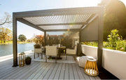 Maranza Louvered Gazebo in Matte Royal Grey. This stunning, weatherproof shelter has flexible shutters. Allowing you to bask in the sunshine or chill out in the cool shade. A popular option with customers is to structure these over hot tubs or why not try over a Suns Lifestyle dining set, as seen below.